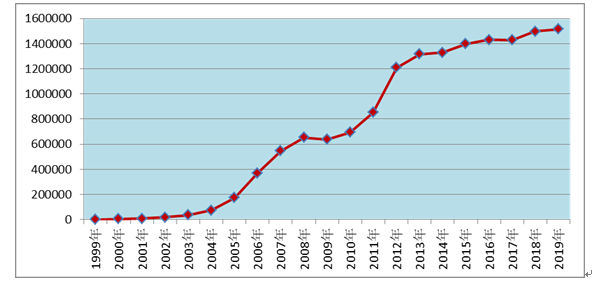 2019年全國藥品不良反應監(jiān)測網(wǎng)絡收到《藥品不良反應/事件報告表》151.4萬份。1999年至2019年,全國藥品不良反應監(jiān)測網(wǎng)絡累計收到《藥品不良反應/事件報告表》1,519萬份(圖1)。