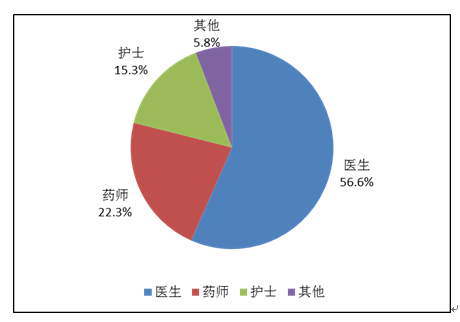 按照報告人職業(yè)統(tǒng)計,醫(yī)生占56.6%,藥師占22.3%,護士占15.3%,其他職業(yè)占5.8% (圖4)。