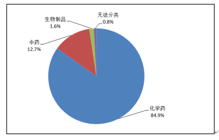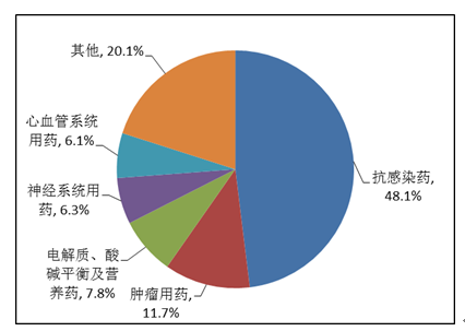 按照藥品類別統(tǒng)計,化學藥品占86.6%,中藥占12.6%,生物制品占0.8%。化學藥品排名居前的藥品類別是抗感染藥、心血管系統(tǒng)用藥、腫瘤用藥、神經(jīng)系統(tǒng)用藥、電解質(zhì)、酸堿平衡及營養(yǎng)藥;中藥排名居前的藥品類別是理血劑、補益劑、祛濕劑、開竅劑、清熱劑。