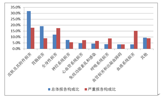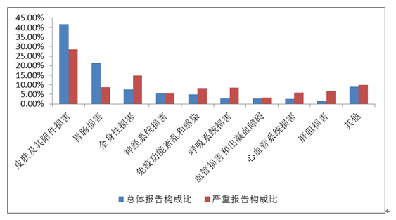 2019年國家基本藥物化學藥品和生物制品不良反應/事件報告,按照藥品類別統(tǒng)計,報告數(shù)量排名前5位的分別是抗微生物藥、心血管系統(tǒng)用藥、抗腫瘤藥、激素及影響內(nèi)分泌藥、治療精神障礙藥;累及器官系統(tǒng)排名前5位的是皮膚及其附件損害、胃腸損害、全身性損害、神經(jīng)系統(tǒng)損害以及血液系統(tǒng)損害。
