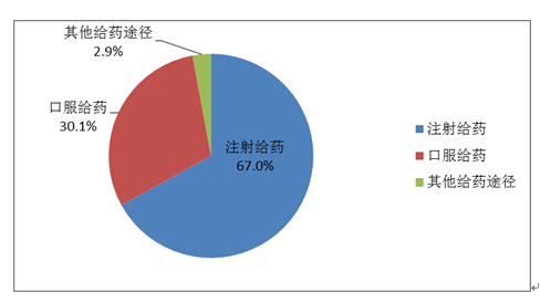 按照藥品給藥途徑統(tǒng)計,注射給藥占67.0%、口服給藥占30.1%、其他給藥途徑占2.9%(圖16)。注射給藥中,靜脈注射給藥占92.7%、其他注射給藥占7.3%。